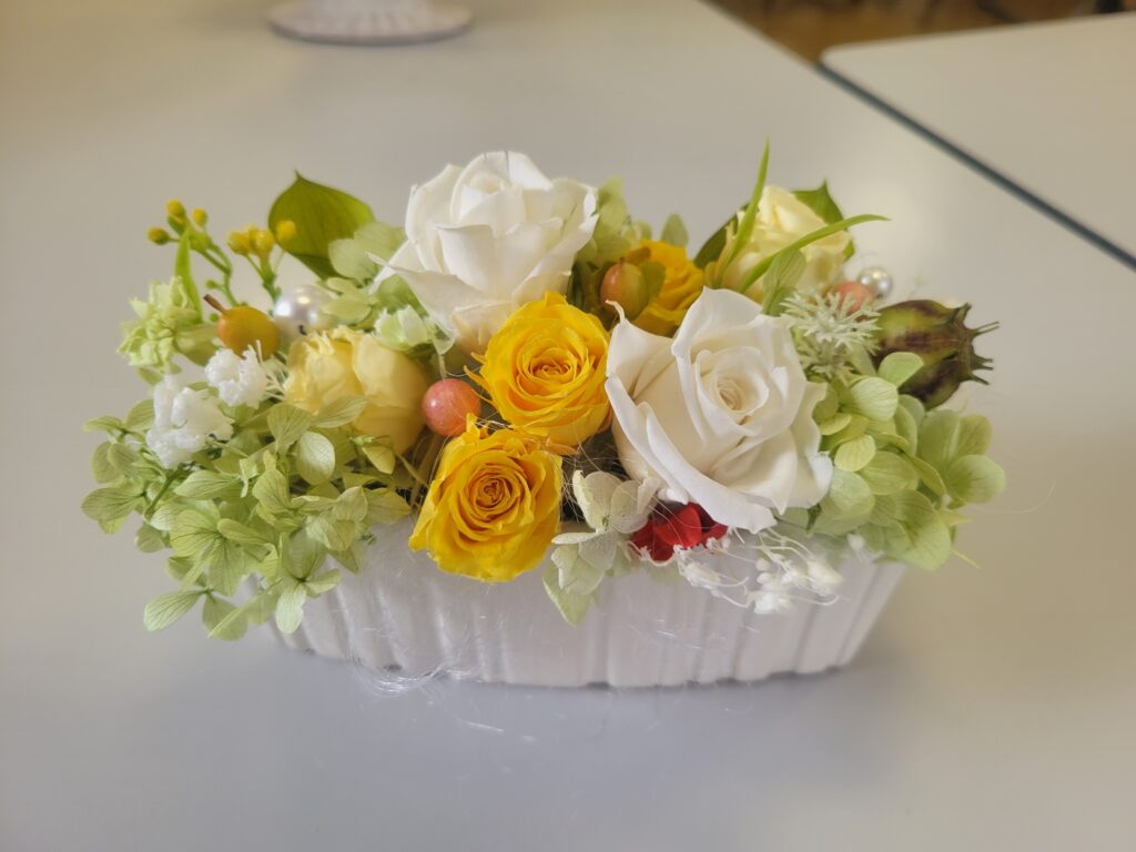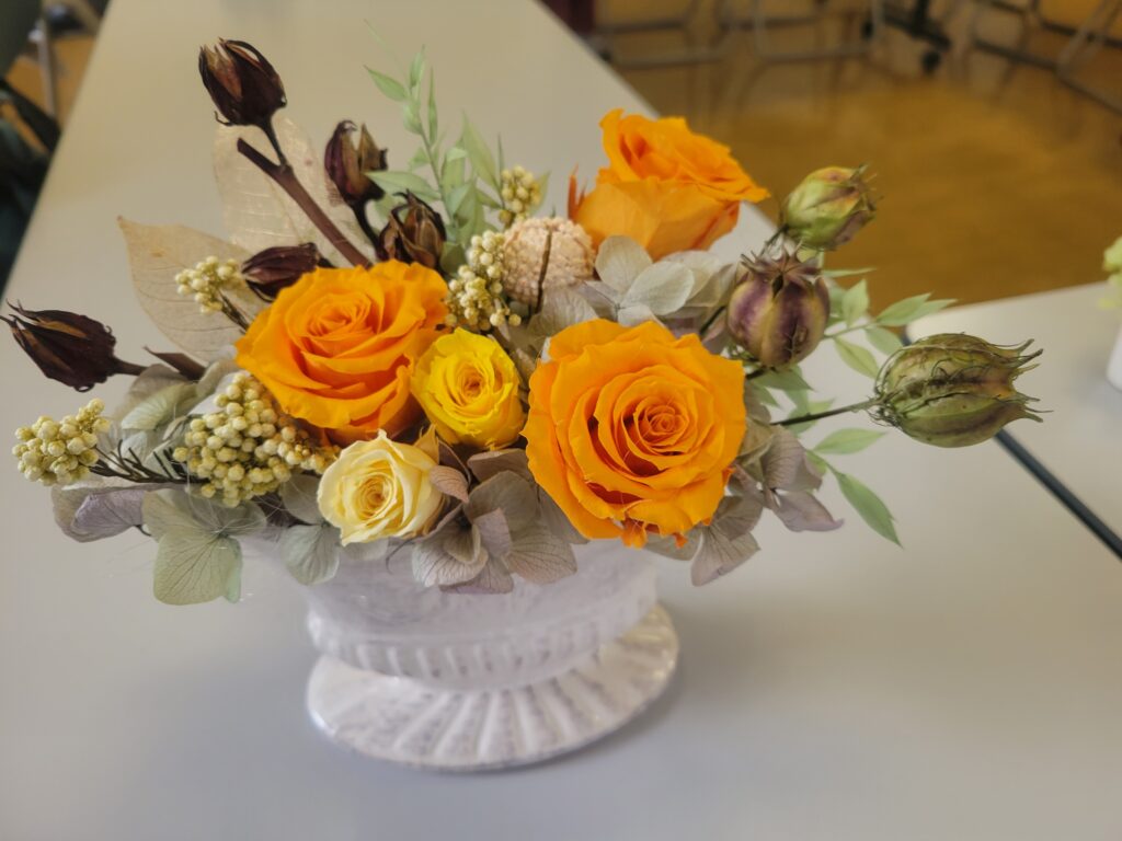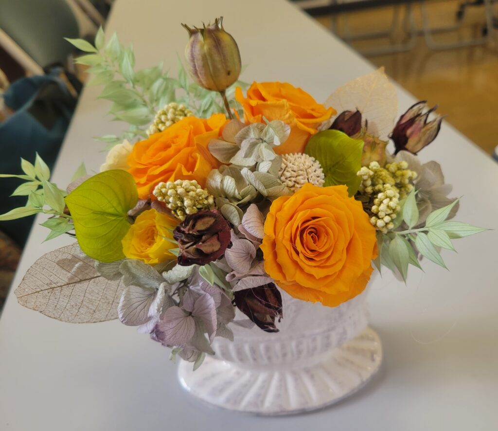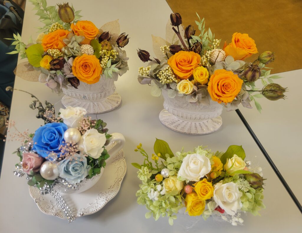 どのアレンジもオレンジ等明るいローズを使い、元気いっぱいの作品です。